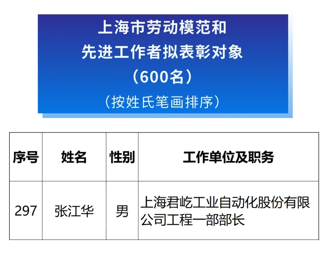 【Freudige Nachricht】Herzlichen Glückwunsch an Zhang Jianghua, den Abteilungsleiter von Shanghai Junyi Engineering Division 1, zum Einzug in die Riege der Arbeitsmuster der Stadt Shanghai!